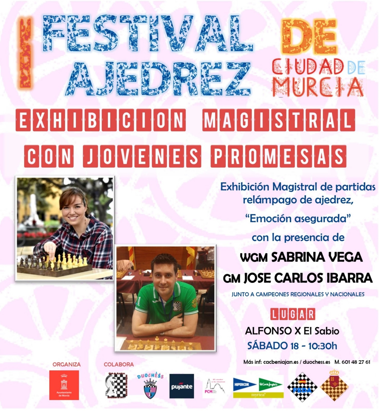 - 10:30: Exhibición magistral de partidas relámpago de ajedrez donde podremos ver jugadores de talla mundial como son la pentacampeona nacional Sabrina Vega o el Gran Maestro murciano José Carlos Ibarra jugar emocionantes partidas contra diferentes maestros fide, campeones regionales y nacionales. ¿Quién será el vencedor de la exhibición?